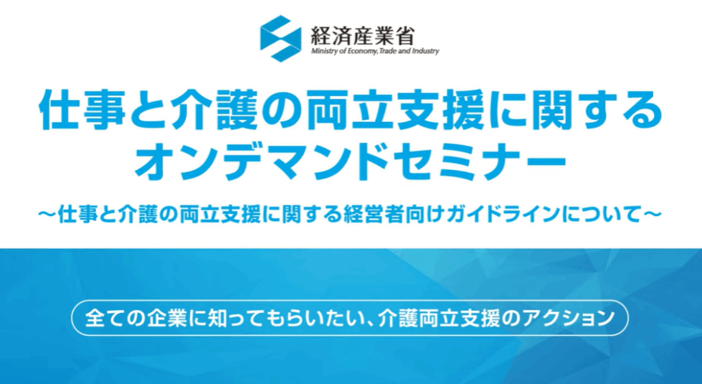経済産業省では、高齢化の進行に伴い、中小企業において従業員が安心して働き続けられる環境づくりを推進する為「中小企業向け 仕事と介護の両立支援セミナー」を配信しています。「【基調講演】人的資本経営時代の”働き方の戦略”と両立支援」の他、「仕事と介護を両立しやすい環境づくりに向けて」、「仕事と介護の両立支援に関する経営者向けガイドラインについて」など計3本の動画を経済産業省公式YouTubeチャンネル「METI channel」で視聴できます。